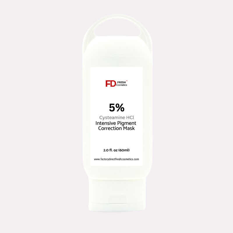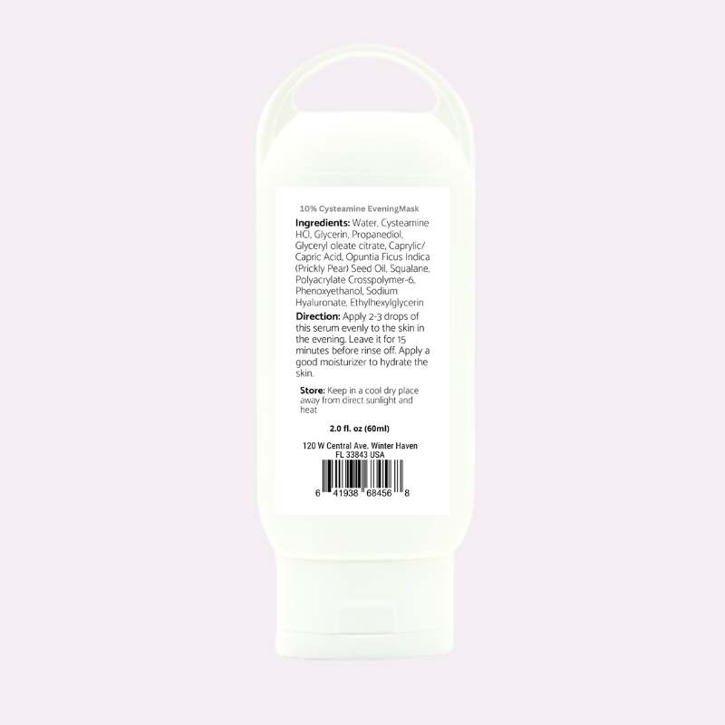 This mask is designed for fade-pigmented skin concerns. Clinical studies have shown that cysteamine's strength is compatible with 2% hydroquinone (HD) without HD's cytotoxicity and skin irritation. It takes 6 weeks to produce visible results and is safe for long-term pigment management. Using 10% tranexamic Acid gel will speed up the lightening process for clear, clean, and radiant skin.