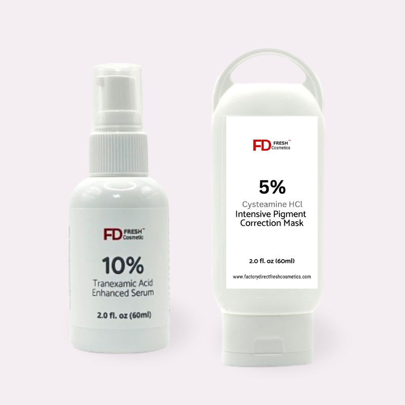This kit contains one 10% Tranexamic Acid in double hyaluronic Acid Serum, which can be used twice daily, and one 5% Cysteamin Gel Mask, used in the evening.